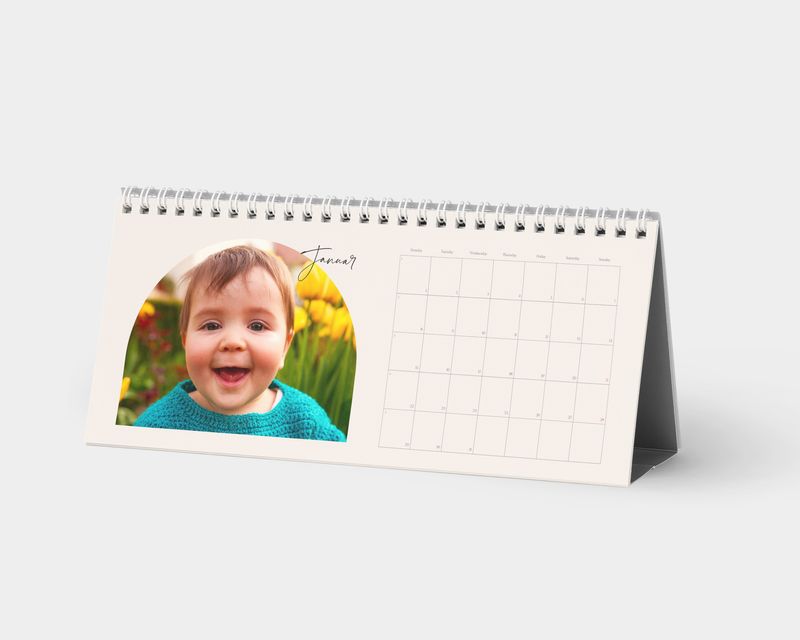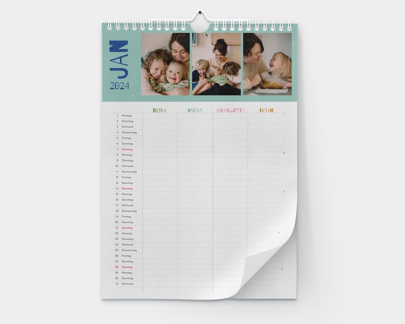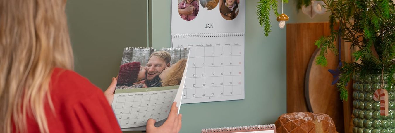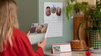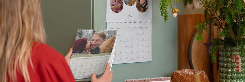 Je nach Größe haben unsere Fotokalender unterschiedliche Raster für Einträge. Größere Wandkalender (wie A3 und A4 doppelt) haben Kästchen, die viel Platz zum Eintragen von Terminen oder Notizen bieten. Kleinere Kalender (A5 und Tischkalender) haben Zahlenraster mit einem Überblick über dem Monat, sodass deine Fotos im Vordergrund stehen. Unsere Familienplaner sind Fotokalender mit Spalten, die Platz für die Termine von jedem Familienmitglied bieten.