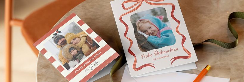 Gestalte eine persönliche Einladung zur Weihnachtsfeier oder versende festliche Grüße mit personalisierten Weihnachtskarten und füge ein schönes Winterfoto hinzu. Du kannst mit unseren ClipArts spielen und eine einzigartige Weihnachtskarte erstellen.