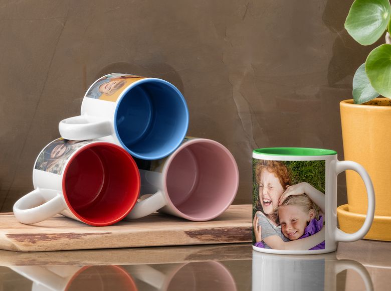 Ein Tupfer Farbe ist ideal, um deine Stimmung zu heben – und da kommen unsere Tassen gerade richtig! Die Fototassen sind innen farbig und haben auf der Außenseite Platz für deine schönsten Fotos und einen tollen Spruch, damit du den Tag gleich mit einem Lächeln startest. Du kannst die Innenfarbe auch mit deinem Foto abstimmen und so für jeden Anlass ein passendes Geschenk gestalten.